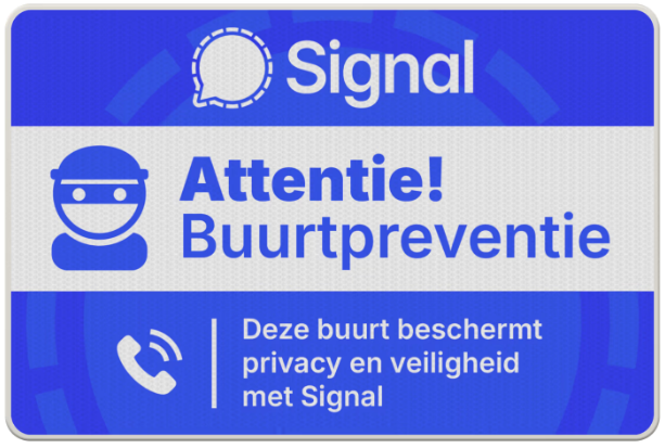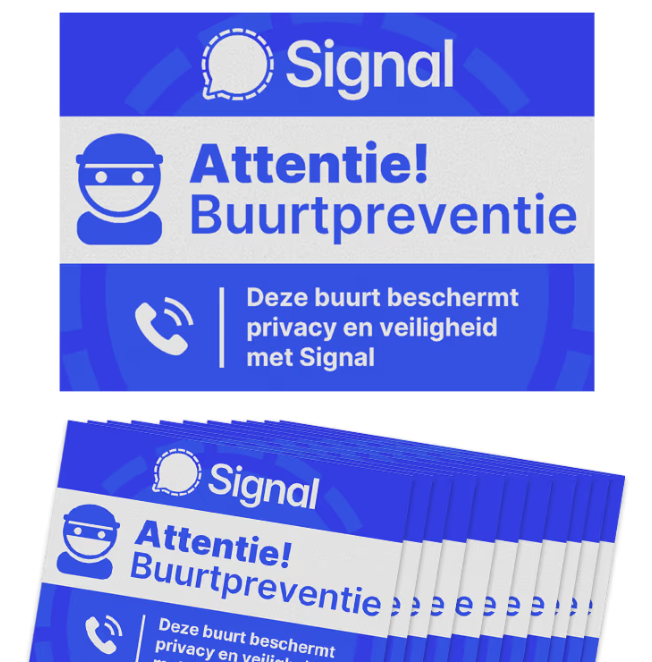 Vanaf vandaag zijn Signal buurtpreventieborden en stickers beschikbaar in Nederland. Buurtpreventiegroepen die overstappen op Signal kunnen zo zichtbaar maken dat zij kiezen voor privacy en veiligheid, terwijl gemeentes nog steeds weigeren neutrale borden te plaatsen.